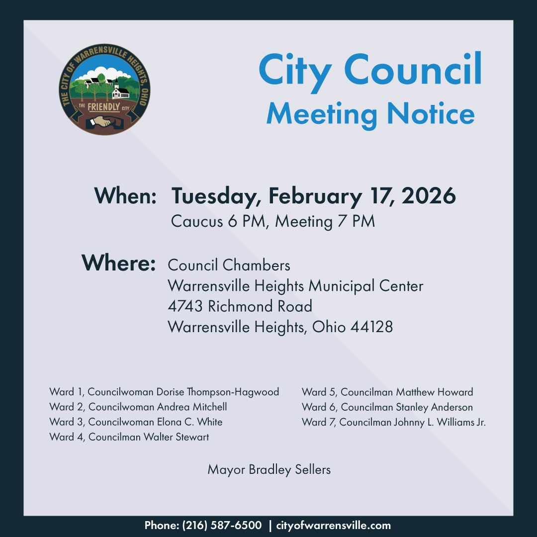 The next Warrensville Heights City Council meeting will be Tuesday, February 17, 2026, in Council Chambers, at the Warrensville Heights Municipal Center. Caucus starts at 6 PM, Meeting at 7 PM. #cityofwarrensville